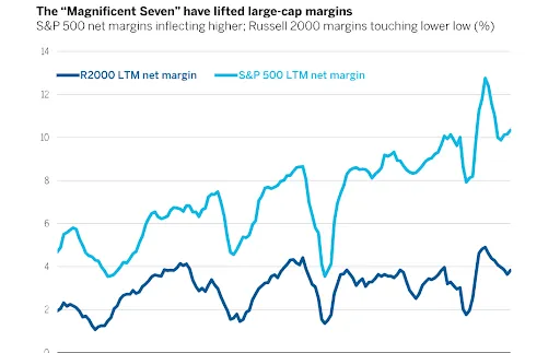 According to a recent Wall Street Journal article quoted in the report, the forward price-to-earnings ratio for the S&P Small Cap 600 is 13x, as compared to 19x for the S&P 500 and 32x for the Magnificent 7. In other words, small caps are on sale. Would you rather buy that brand new pair of jeans for $200, or wait until it goes on sale and get it for $100? It’s the same phenomenon going on with small caps. The Magnificent Seven have gotten so expensive and we all know that trees don’t grow to the sky.