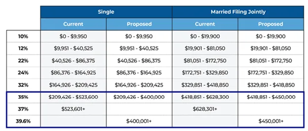 The top tax rate will increase to 39.6% on high earners. The top tax rate had been at 39.6% from 2013 through 2017. It was reduced to 37% beginning in 2018 with the enactment of the Tax Cuts and Jobs Act of 2017. If enacted, the current bill would reinstall 39.6% as the top ordinary income tax rate, beginning in 2022. Currently, top tax rates are at 37% and start at $523,600 for single filers and $628,300 for married filers. The new law will not only increase top marginal brackets, but will also lower the amount of income required to reach them to $400,000 for single filers and $450,000 for married filers.