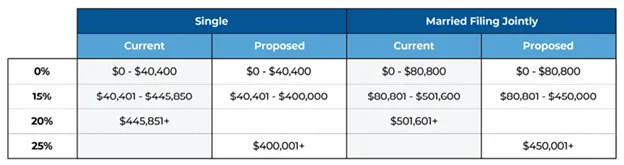 The proposal also aligns the income threshold for the top long-term capital gains rate with the income threshold for the top ordinary income tax rate. So, the top long-term capital gains rate of 25% will take effect at the same threshold ($400,000 for single filers, $450,000 for married filing jointly), at which point the 35% ordinary income tax bracket would become the 39.6% ordinary income tax bracket.