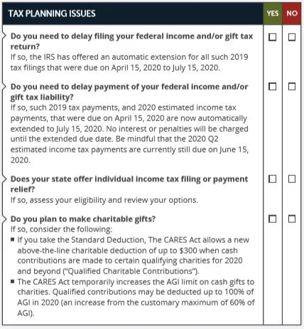 The Coronavirus Aid, Relief and Economic Security (CARES) Act was signed into law recently. Below you will find a list of the new emergency relief options for individuals to consider. We are developing strategies around items in the relief act to save you money. Please review the list and contact our office if you would like to discuss any of the options in more detail.
