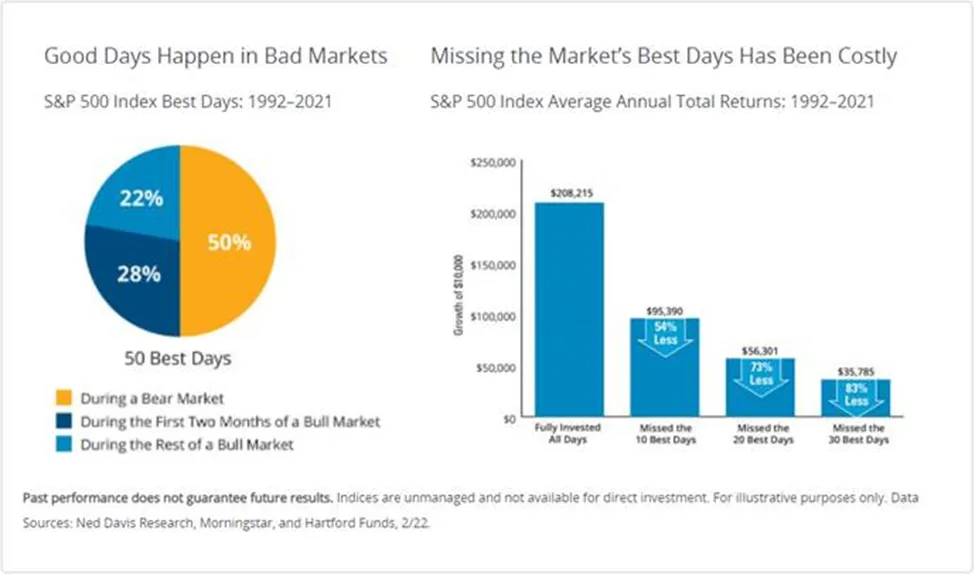 The chart below shows that good days happen even in bad markets. You’ll notice that during a bear market (when the overall stock market drops in value by 20% or more from its recent high) 50% of the best performing days in the stock market happen. This is the same as the amount of best performing days that have happened during all bull markets (when the overall market is on a rise).