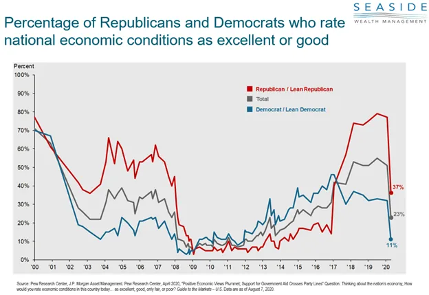 Armed with the knowledge that prevailing wisdom can often be wrong, what can we actually do about it? One thing we always recommend is not letting your emotions drive your decision-making process. The chart above shows how people feel about the economy during different time periods. Republicans (the red line), generally felt good about the economy during the early part of the 2000’s until their positive feelings swiftly changed and pretty much fell off a cliff. A lot of these feelings came from the great Financial Crisis of 2008, but they also coincided with a victory of President Obama in the 2008 Presidential Election and lasted all the way until 2017 after Trump was elected. From a Presidential cycle standpoint, their feelings coincide with the Obama and Trump presidencies. Opposite, Democrats (shown by the blue line) felt less positive in the early part of the 2000’s, but feelings progressed through the Obama years. Is this a coincidence or are the feelings we have about the economy tied more to our political beliefs? What is the moral of all this? We believe you should not let your political leanings impact your investment decisions.