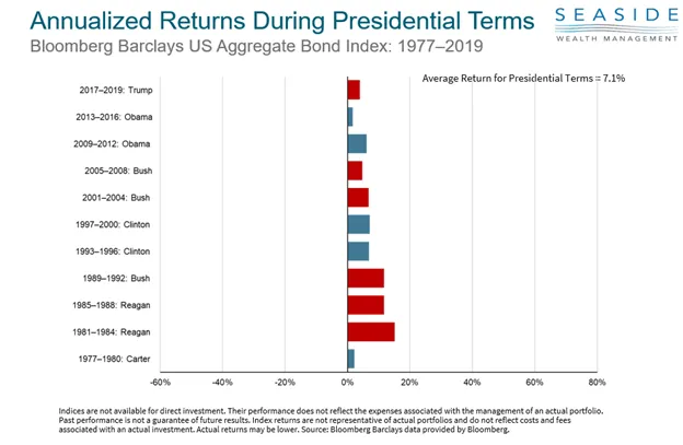 Shifting away from equities, let us focus on fixed income. One thing to notice is that bond returns have been quite high, averaging 7% throughout each Presidential term. It is important to remember that we have seen interest rates drop from the high teens in the 1970’s to near zero today so it is not surprising to see more recent presidential terms show lower fixed income returns. The other item to note is that, unlike equities, there has been no Presidential terms over the time that have experienced a negative return in bonds.