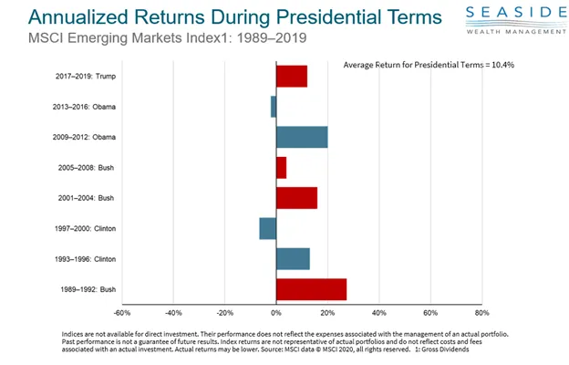 When we look at Emerging Markets there were two Presidential terms where the returns were negative. But, this time both were during a Democratic presidential term. Honestly, our best guess is the negative International returns were more correlated to things outside of who was in the White House and were more affected by currency prices and other variables beyond what a U.S. President can control.