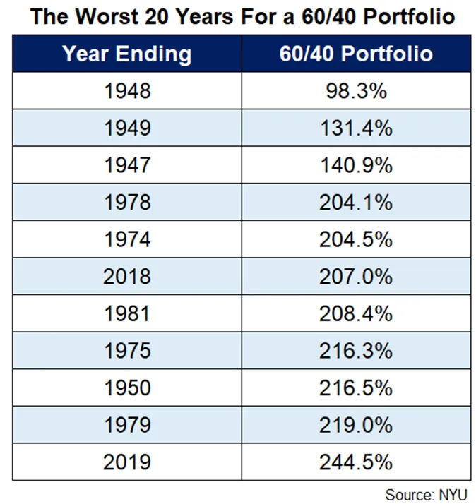 Looking at the 60/40 portfolio, the good news is the rough starts in the markets won’t last forever. History shows us that declines tend to lead to periods of excellent performance over time. Even the worst 20-year period had some pretty strong results.