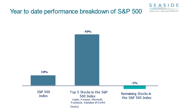 If you are taking the route of the short-term investor, you might be investing in individual stocks to help turn a quick profit. This is great, but near impossible to consistently do over time. If you look at this graph you can see the S&P 500 during this period was up 10%. If we look under the hood only five stocks out of 500 were up and 495 were down.