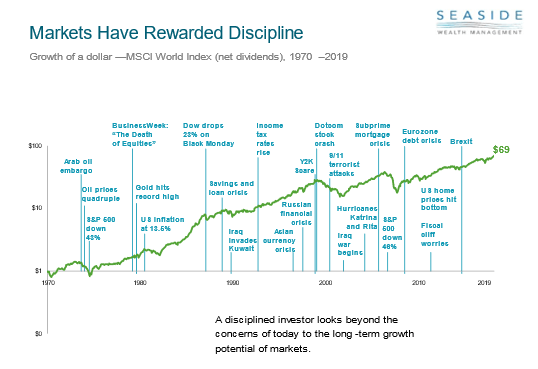To piggy back on some of the points above as a short-term investor you are forced to pay attention to the day-to-day movement, or the next “black swan” event. Here is a chart that shows how the markets have rewarded discipline through different macroeconomic events.