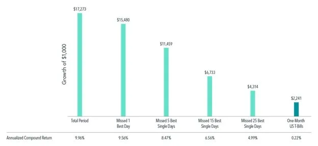 Exhibit 2 helps illustrate this point. It shows the annualized compound return of the S&P 500 Index going back to 1990 and illustrates the impact of missing out on just a few days of strong returns. The bars represent the hypothetical growth of $1,000 over the period and show what happened if you missed the best single day during the period and what happened if you missed a handful of the best single days. The data shows that being on the sidelines for only a few of the best single days in the market would have resulted in substantially lower returns than the total period had to offer.