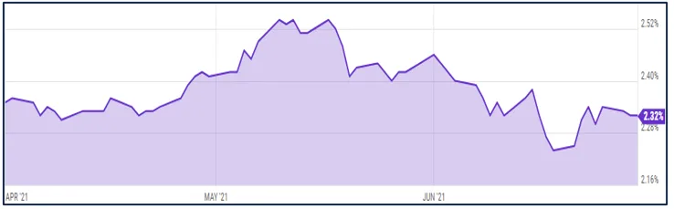 The flattening yield curve was largely a result of changes in Fed policy expectations. Specifically, during their mid-June meeting, Fed officials suggested they expect to increase interest rates by late 2023, which is sooner than they had stated back in March. This change in expected policy pushed short term rates higher towards the end of June (but really only by a few basis points), reflecting the idea the Fed would start raising short term rates from their current near zero levels. Of course, this means the Fed will probably start tapering their bond purchases as well, which is a likely precursor to actually raising rates.