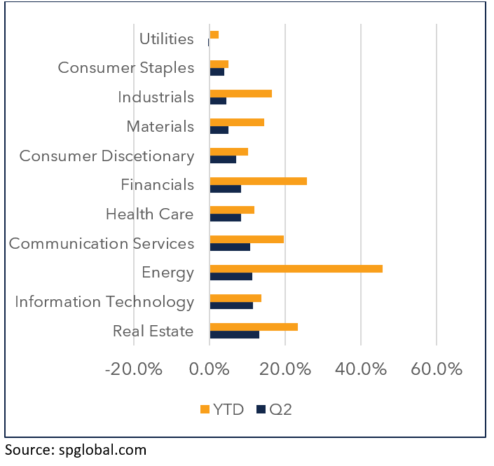 From an S&P sector perspective, ten of the eleven sectors were positive for Q2 2021 (only utilities were slightly negative) with four generating 10%+ returns. Exhibit 6 shows the quarterly and year-to-date returns for each S&P 500 sector. As you can see, sectors that were hardest hit during the Covid shutdown (energy, financials, real estate) are the best performing sectors so far in 2021.