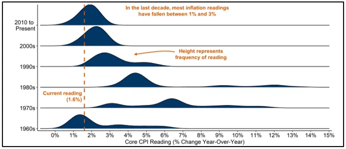 Let’s take a step back for a second and realize that when people refer to high inflation, they are often referring to 1970’s style inflation, when it reached levels in the teens. However, looking at Exhibit 1, the reality is we need to go back to the 1990s to see inflation near or above 3% with any consistency.