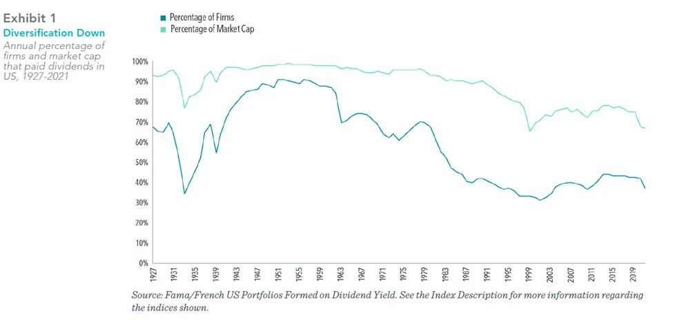 Before diving into the performance of dividend paying stocks it’s important to note that the number of companies paying dividends has declined to only 38% of firms in 2021. This means that if you chase dividend paying companies you will be sacrificing diversification since you will own so many fewer names. In addition, a dividend focused strategy does not necessarily provide stable income. In fact, changes in dividend policy are common, especially during times of higher uncertainty. For example, many dividend payers cut their dividends during the pandemic in the first three quarters of 2020, dividends from each dollar invested in US markets decreased by 22% compared to the same period in 2019.